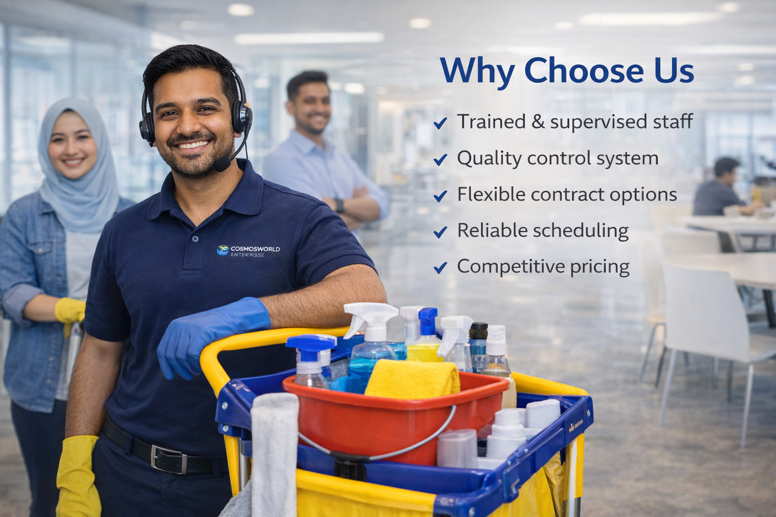 COSMOSWORLD Enterprise is a professional cleaning and facility management company committed to delivering high-quality, consistent, and cost-effective cleaning solutions. We serve residential clients, commercial offices, and food & beverage businesses, including restaurants, cafés, outlets, and food courts.